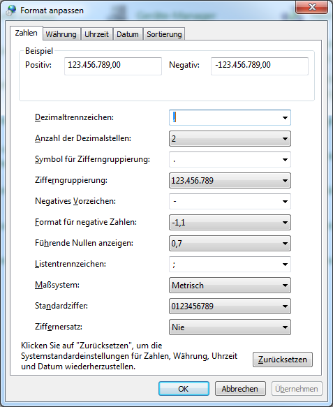 Gehen Sie unter 'Start' -> 'Systemsteuerung' -> 'Region und Sprache' -> anschließend wählen Sie unten links 'Weitere Einstellungen...' -> und wählen im Anschluss unten links 'Zurücksetzen'.