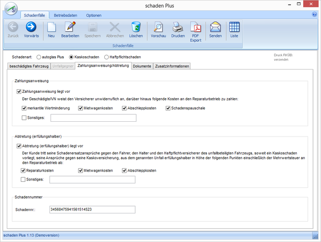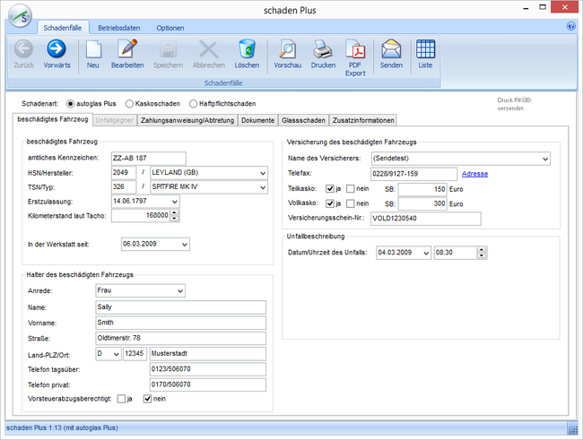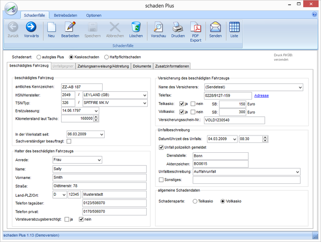 Alle für den Schadenfall notwendigen Daten können in zwei (Kaskoschaden) bzw. drei (Haftpflichtschaden mit Unfallgegner) Karteireitern einer Maske eingegeben werden.