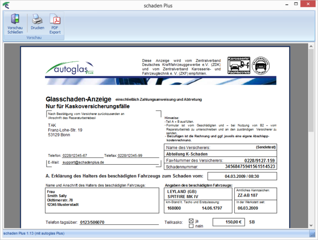 Sie können das Formular in der Vorschau kontrollieren und drucken oder als PDF-Datei exportieren.