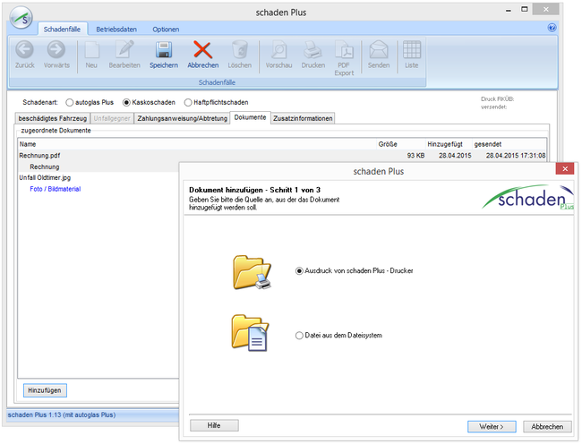- Rechnung und andere Dokumente mit dem schaden Plus Drucker als PDF- und Fotos als JPG-Datei beifügen