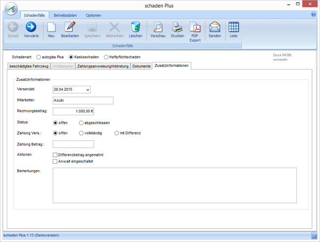 In der Maske Optionen können Sie den Reiter Zusatzinformationen aktivieren, um beispielsweise Status, Betrag, Mitarbeiter und Bemerkungen anzugeben. In der Liste der Schadenfälle werden dann drei zusätzliche Spalten eingeblendet mit Versanddatum, Status und Betrag.